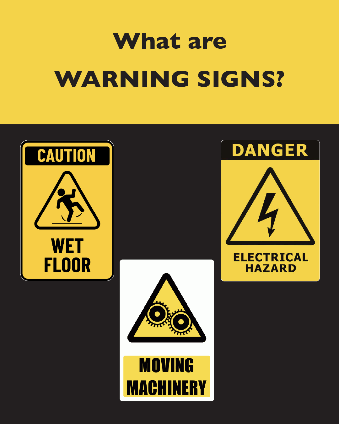 Warning signs make you aware of risks, dangers and hazards, so you can stay safe.
